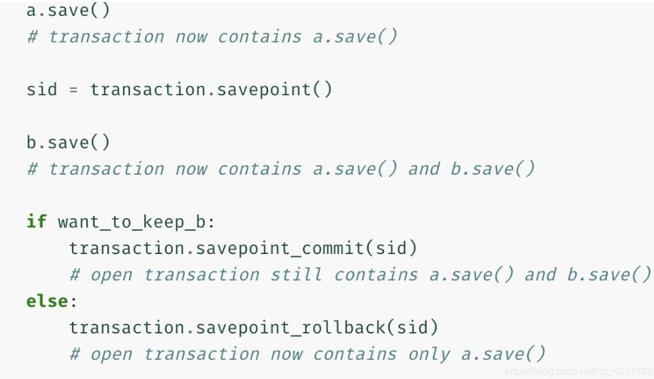 如果不满足xxxxxxxx条件,则执行事务回滚,此时我们定义的保存点之前的a.save()数据不会收到影响,但在保存点之后的b.save()的数据将会回滚。