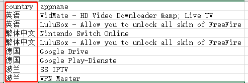 结果,生成了output.xlsx,将appname_test.xlsx中的汇总数据根据不同国家分到了不同sheet: