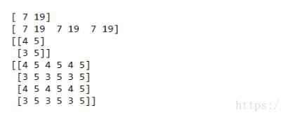 import tensorflow as tf a = tf.constant([7,19]) a1 = tf.tile(a,multiples=[3]) #第一个维度扩充3遍 b = tf.constant([[4,5],[3,5]]) b1 = tf.tile(b,multiples=[2,3])#第一个维度扩充2遍,第二个维度扩充3遍 with tf.Session() as sess: print(sess.run(a)) print(sess.run(a1)) print(sess.run(b)) print(sess.run(b1))