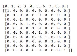 import tensorflow as tf import numpy as np data = np.linspace(0,9,10) label = tf.one_hot(data,10) with tf.Session() as sess: print(data) print(sess.run(label))