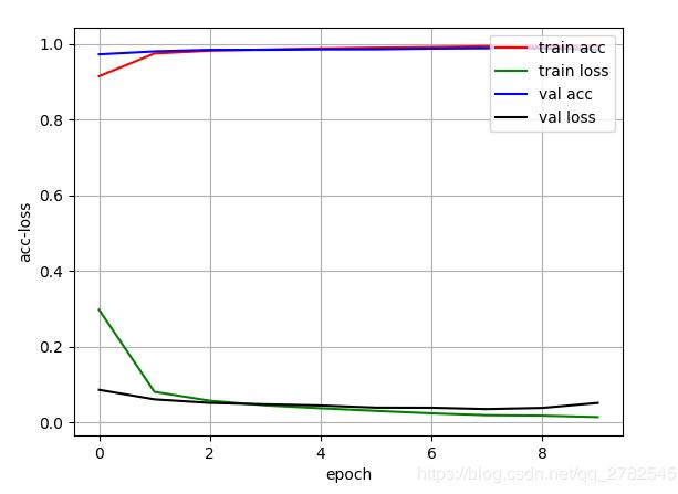 Epoch 1/10 2019-06-23 08:44:32.930737: I tensorflow/core/common_runtime/gpu/gpu_device.cc:1432] Found device 0 with properties: name: GeForce GTX 950 major: 5 minor: 2 memoryClockRate(GHz): 1.2155 pciBusID: 0000:01:00.0 totalMemory: 2.00GiB freeMemory: 1.64GiB 2019-06-23 08:44:32.937390: I tensorflow/core/common_runtime/gpu/gpu_device.cc:1511] Adding visible gpu devices: 0 2019-06-23 08:44:37.003650: I tensorflow/core/common_runtime/gpu/gpu_device.cc:982] Device interconnect StreamExecutor with strength 1 edge matrix: 2019-06-23 08:44:37.006358: I tensorflow/core/common_runtime/gpu/gpu_device.cc:988] 0 2019-06-23 08:44:37.008076: I tensorflow/core/common_runtime/gpu/gpu_device.cc:1001] 0: N 2019-06-23 08:44:37.012620: I tensorflow/core/common_runtime/gpu/gpu_device.cc:1115] Created TensorFlow device (/job:localhost/replica:0/task:0/device:GPU:0 with 1388 MB memory) -> physical GPU (device: 0, name: GeForce GTX 950, pci bus id: 0000:01:00.0, compute capability: 5.2) 60000/60000 [==============================] - 18s 302us/step - loss: 0.2979 - acc: 0.9151 - val_loss: 0.0863 - val_acc: 0.9730 Epoch 2/10 60000/60000 [==============================] - 4s 61us/step - loss: 0.0810 - acc: 0.9753 - val_loss: 0.0611 - val_acc: 0.9808 Epoch 3/10 60000/60000 [==============================] - 4s 59us/step - loss: 0.0575 - acc: 0.9826 - val_loss: 0.0518 - val_acc: 0.9849 Epoch 4/10 60000/60000 [==============================] - 4s 59us/step - loss: 0.0451 - acc: 0.9857 - val_loss: 0.0480 - val_acc: 0.9848 Epoch 5/10 60000/60000 [==============================] - 4s 59us/step - loss: 0.0375 - acc: 0.9886 - val_loss: 0.0449 - val_acc: 0.9860 Epoch 6/10 60000/60000 [==============================] - 3s 57us/step - loss: 0.0307 - acc: 0.9907 - val_loss: 0.0392 - val_acc: 0.9863 Epoch 7/10 60000/60000 [==============================] - 4s 68us/step - loss: 0.0242 - acc: 0.9923 - val_loss: 0.0389 - val_acc: 0.9882 Epoch 8/10 60000/60000 [==============================] - 4s 75us/step - loss: 0.0192 - acc: 0.9944 - val_loss: 0.0354 - val_acc: 0.9891 Epoch 9/10 60000/60000 [==============================] - 4s 66us/step - loss: 0.0180 - acc: 0.9942 - val_loss: 0.0385 - val_acc: 0.9885 Epoch 10/10 60000/60000 [==============================] - 4s 67us/step - loss: 0.0143 - acc: 0.9956 - val_loss: 0.0516 - val_acc: 0.9860