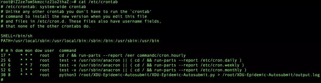 编辑/etc/crontab,在最后的#上面加上下图内容,最后两个分别是py文件和log文件的路径,整行内容表示的是在每天8:30以root身份自动运行右侧命令。