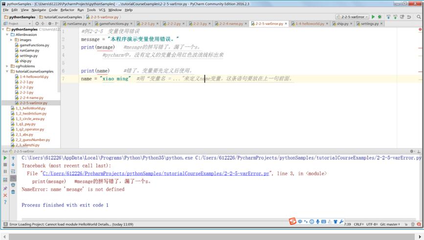 错误信息中,显示列出了程序的运行轨迹(Traceback)。这里,运行轨迹不长,以后会遇到很长的情形。运行轨迹只有一条,指出文件2-2-5-varError.py中的第3行(line 3),内容是“print(mesage) #mesage的拼写错了,漏了一个s”,存在错误。文件路径用蓝色字体程序,说明它是一个超链接,点击它,上面编辑器就列出该行代码及其附近的代码。