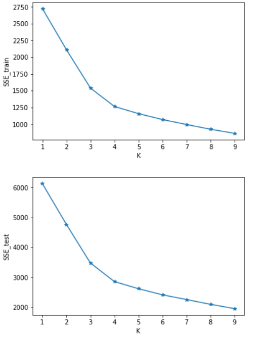 首先确定k,随机选择k个初始点之后所有点根据距离质点的距离进行聚类分析,离某一个质点a相较于其他质点最近的点分配到a的类中,根据每一类mean值更新迭代聚类中心,在迭代完成后分别计算训 练集和测试集的损失函数SSE_train、SSE_test,画图进行分析。