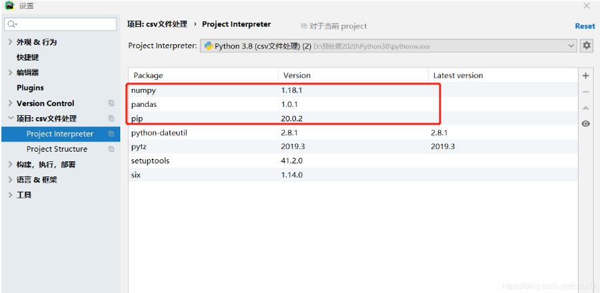 完成了以上步骤返回pycharm查看,发现pycharm安装的包还显示没有pandas于是电脑重启之后还是不行,那就点击**【设置setting】→【项目】→【project interpreter】→查看是否有找到pandas在里面**