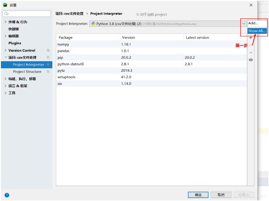 进行完上面的步骤仍然没有成功导入进包,点击【设置setting】→【项目】→【project interpreter】→点击小图标设置→show all