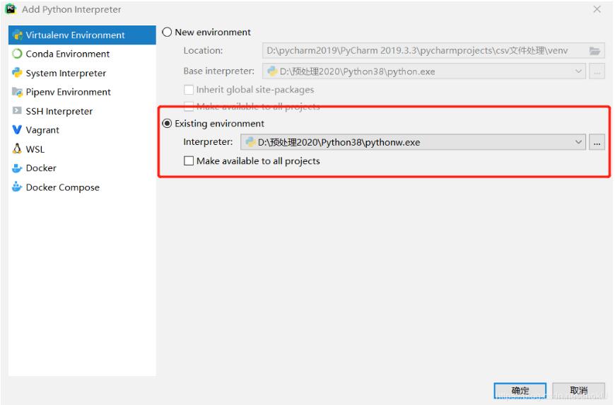然后在你的python包里面找到一个**【pythonw.exe】的文件,然后点击【Existing enviroment】**