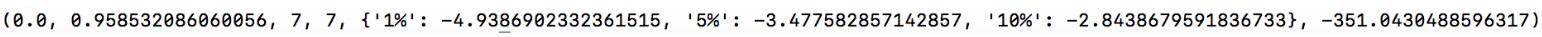 from statsmodels.tsa.stattools import adfuller import numpy as np import pandas as pd adf_seq = np.array([1,2,3,4,5,7,5,1,54,3,6,87,45,14,24]) dftest = adfuller(adf_seq,autolag='AIC') dfoutput = pd.Series(dftest[0:4],index=['Test Statistic','p-value','#Lags Used','Number of Observations Used']) # 第一种显示方式 for key,value in dftest[4].items(): dfoutput['Critical Value (%s)' % key] = value print(dfoutput) # 第二种显示方式 print(dftest)
