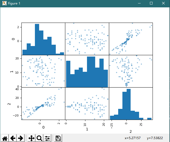import numpy as np import pandas as pd import matplotlib.pyplot as plt # 生成数据 v1 = np.random.normal(0, 1, 100) v2 = np.random.randint(0, 23, 100) v3 = v1 * v2 # 3*100 的数据框 df = pd.DataFrame([v1, v2, v3]).T # 绘制散点图矩阵 pd.plotting.scatter_matrix(df) plt.show()