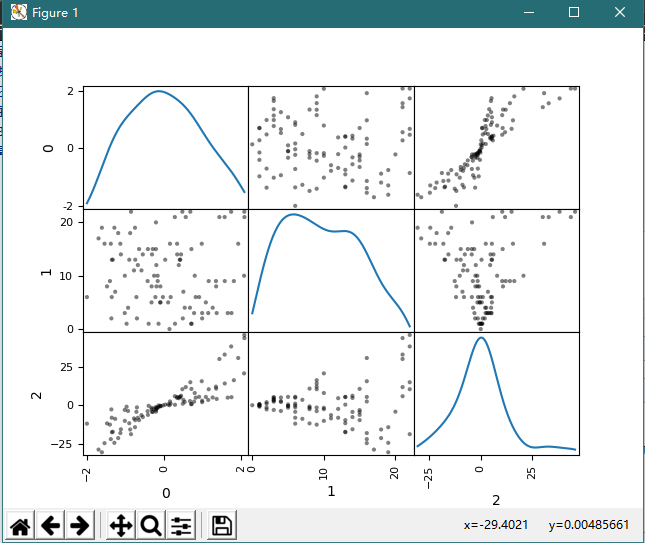 import numpy as np import pandas as pd import matplotlib.pyplot as plt # 生成数据 v1 = np.random.normal(0, 1, 100) v2 = np.random.randint(0, 23, 100) v3 = v1 * v2 # 3*100 的数据框 df = pd.DataFrame([v1, v2, v3]).T # 绘制散点图矩阵 pd.plotting.scatter_matrix(df, diagonal='kde', color='k') plt.show()