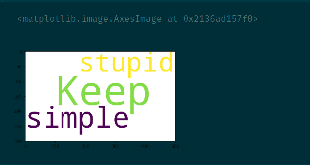 text = 'Keep it simple and stupid.' wc = WordCloud(background_color='white', width=500, height=300) # 实例化词云图对象 wc.generate(text) # 根据文本生成词云图 plt.imshow(wc) # 显示词云图