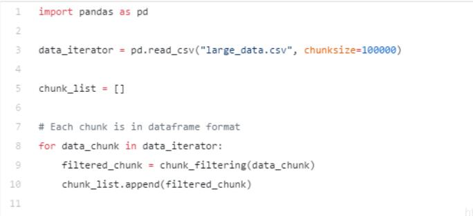 我们可以通过read_csv()方法Chunksize来完成上述步骤。 Chunksize是指pandas 一次能读取到多少行csv文件。这个当然也是建立在RAM 内存容量的基础上。