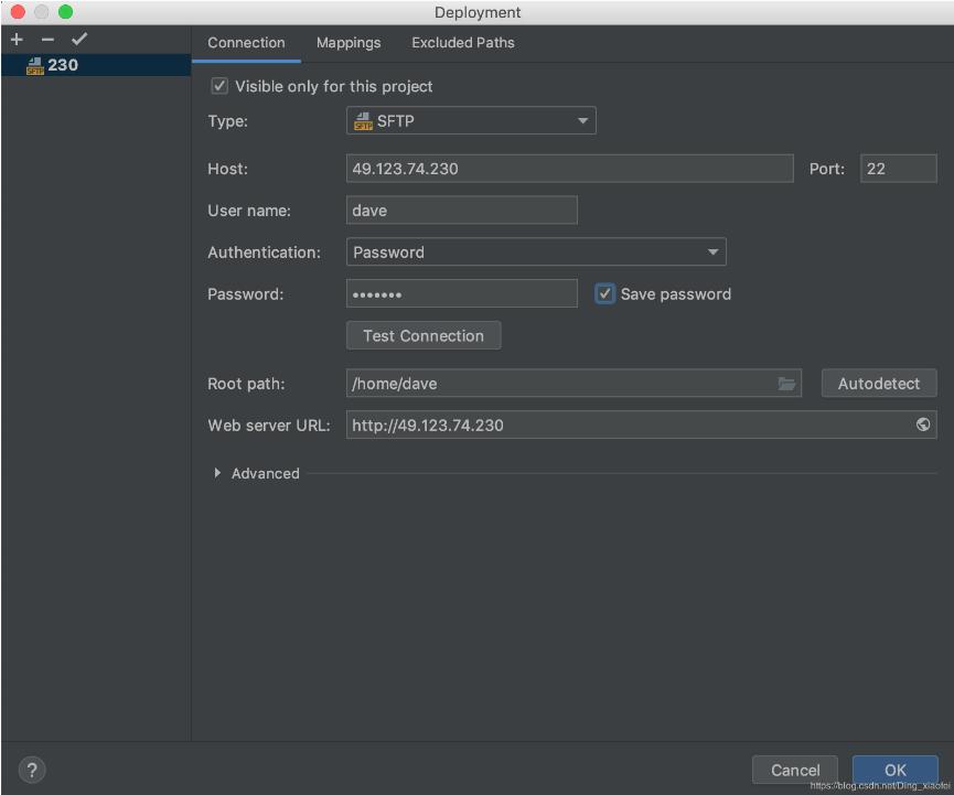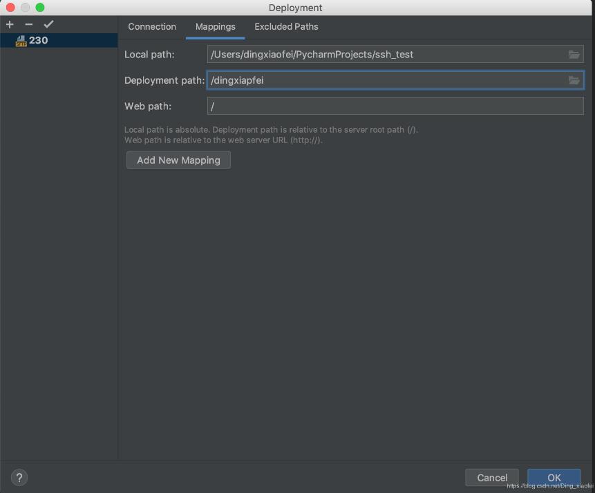 点击mapping,正式建立本地代码和服务器代码的映射,主要要填的就是deployment path,这个目录是建在刚刚设置的根目录下面。建立完映射之后,就可以开始上传你的代码了。