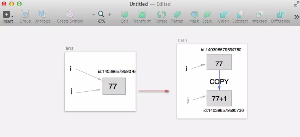 有i和j俩个变量的值为77,通过打印77的ID和变量i,j在内存中的id我们得知它们都是指向同一块内存。所以说i和j都是指向同一个对象的。然后我们修改j的值,让j的值+1.按道理j修改之后应该i的值也发生改变的,因为它们都是指向的同一块内存,但结果是并没有。因为int类型是不可变类型,所有其实是j复制了一份到新的内存地址然后+1,然后j又指向了新的地址。所以j的内存id发生了变化。