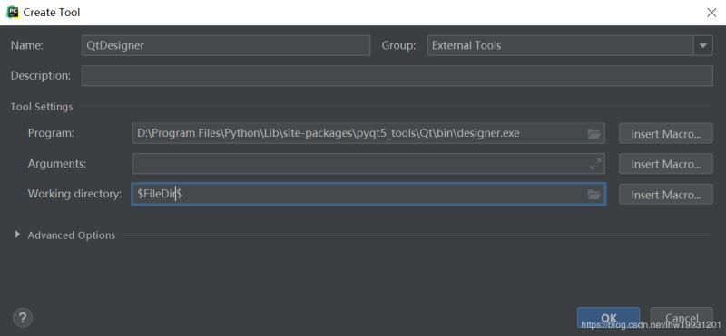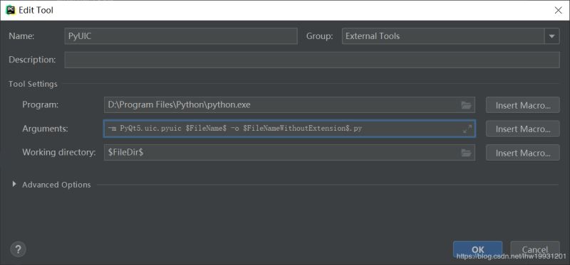Arguments参数写,-m PyQt5.uic.pyuic $FileName$ -o $FileNameWithoutExtension$.py