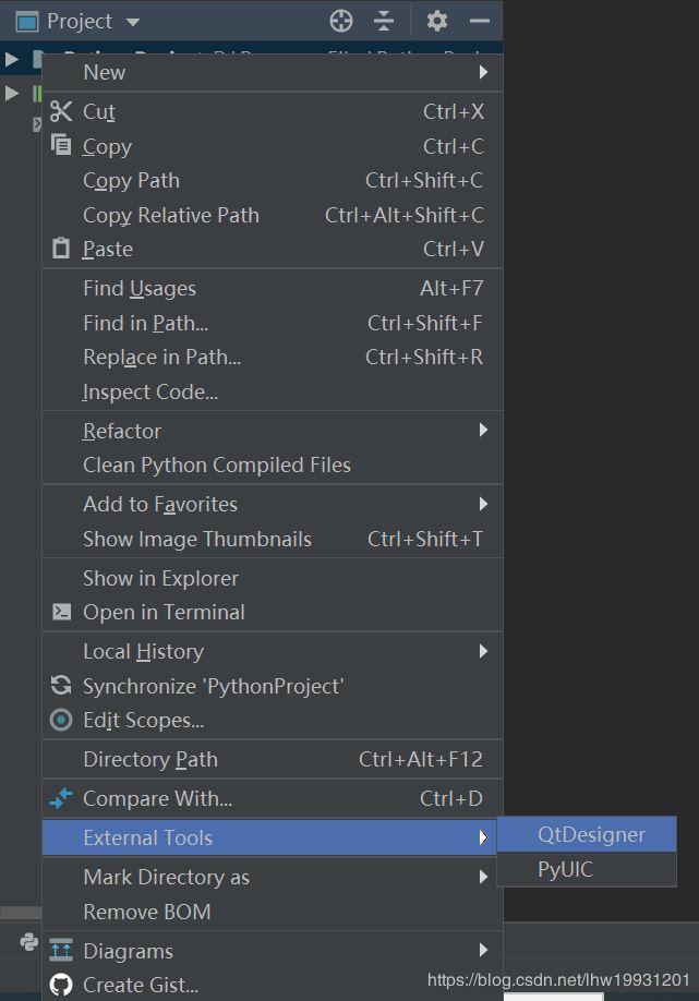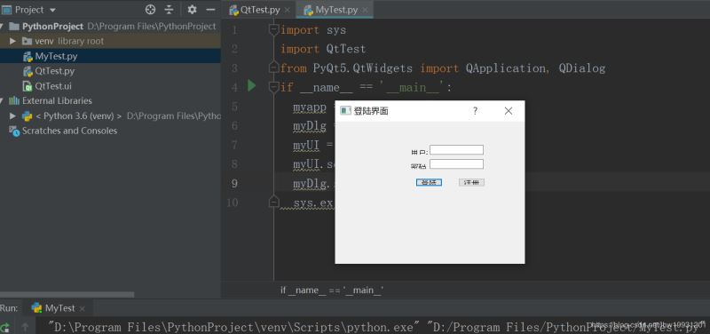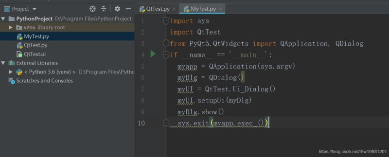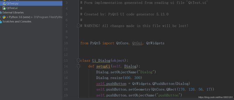 右键点QtTest.ui - External Tools - PyUIC,会自动把ui文件生成python代码QtTest.py,此时项目中多了一个QtTest.py文件,双击可打开查看代码。