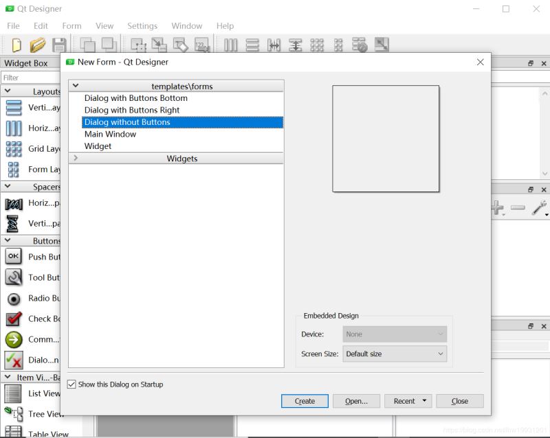 新建一个项目,右键点项目-External Tools-QtDesigner,这时会弹出QtDesigner的设计师界面,随便选择一个模板测试。这里选择第一个不带按钮的对话框,点Create。
