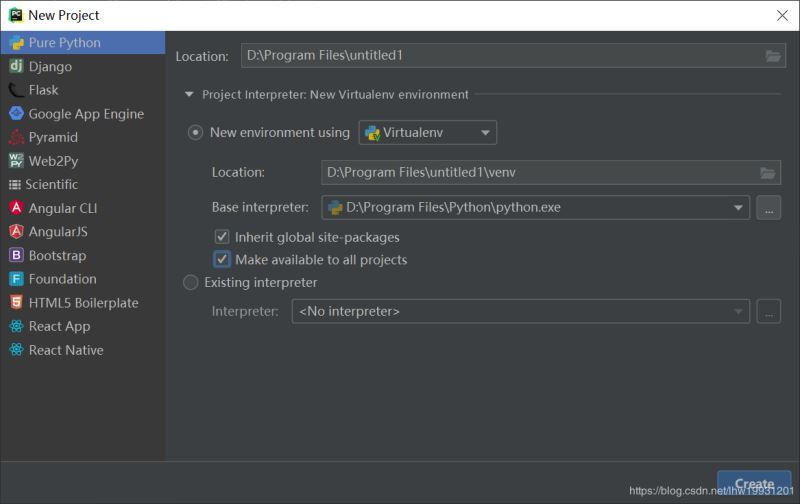 再重新创建一个项目,这时应注意在Base interpreter下面的两个复选框对勾打上。目的是加载第三方库,这样在创建完工程的时候会加载一堆东西。