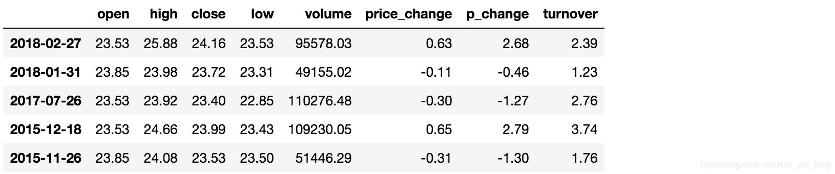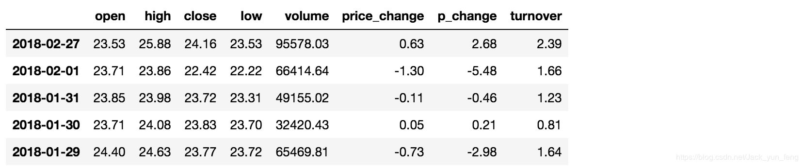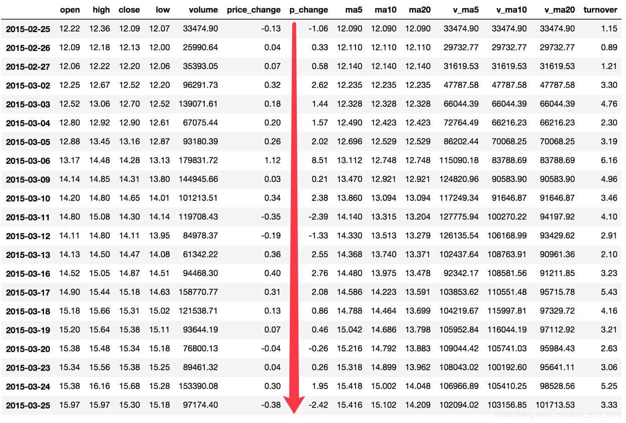 data["open"] > 23 2018-02-27 True 2018-02-26 False 2018-02-23 False 2018-02-22 False 2018-02-14 False # 逻辑判断的结果可以作为筛选的依据 data[data["open"] > 23].head()
