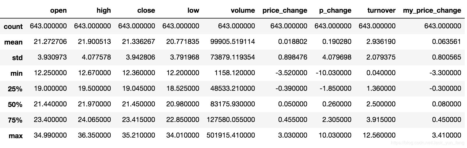 # 使用统计函数:0 代表列求结果, 1 代表行求统计结果 data.max(0) open 34.99 high 36.35 close 35.21 low 34.01 volume 501915.41 price_change 3.03 p_change 10.03 turnover 12.56 my_price_change 3.41 dtype: float64