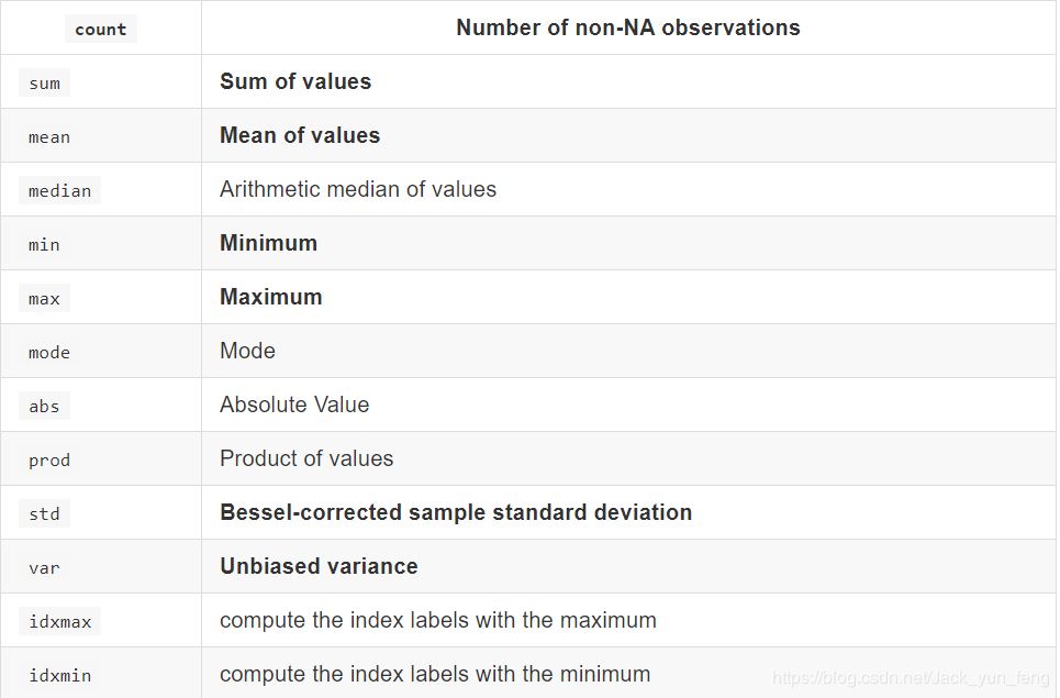 对于单个函数去进行统计的时候,坐标轴还是按照默认列“columns” (axis=0, default),如果要对行“index” 需要指定(axis=1)