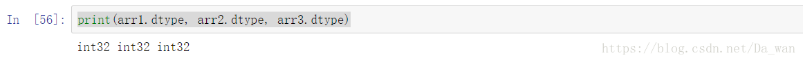 dtype:一个用于说明数组数据类型的对象。返回的是该数组的数据类型。由于图中的数据都为整形,所以返回的都是int32。如果数组中有数据带有小数点,那么就会返回float64。