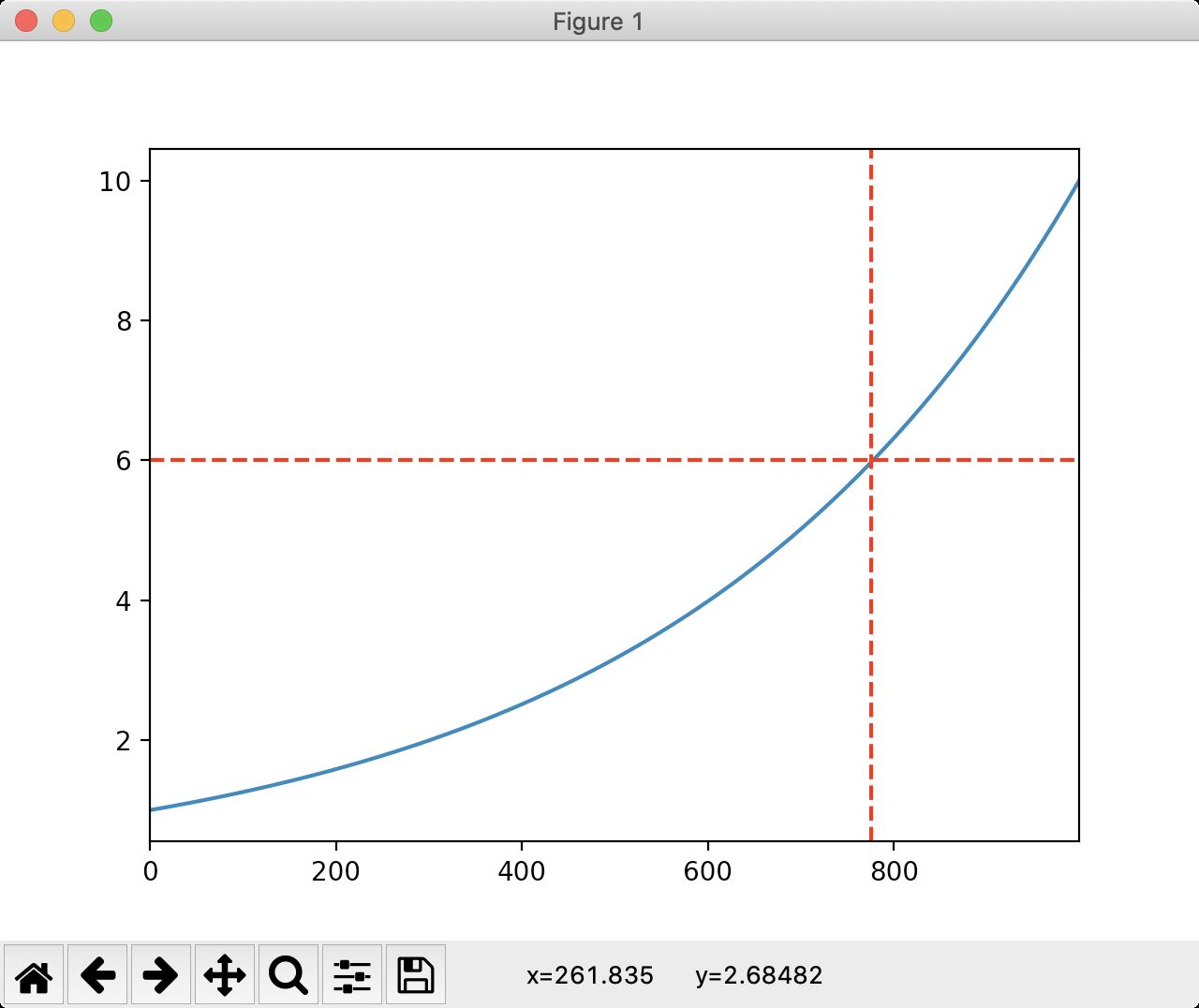 import matplotlib.pyplot as plt ax = df.y1.plot() ax.axhline(6, color="red", linestyle="--") ax.axvline(775, color="red", linestyle="--") plt.show()