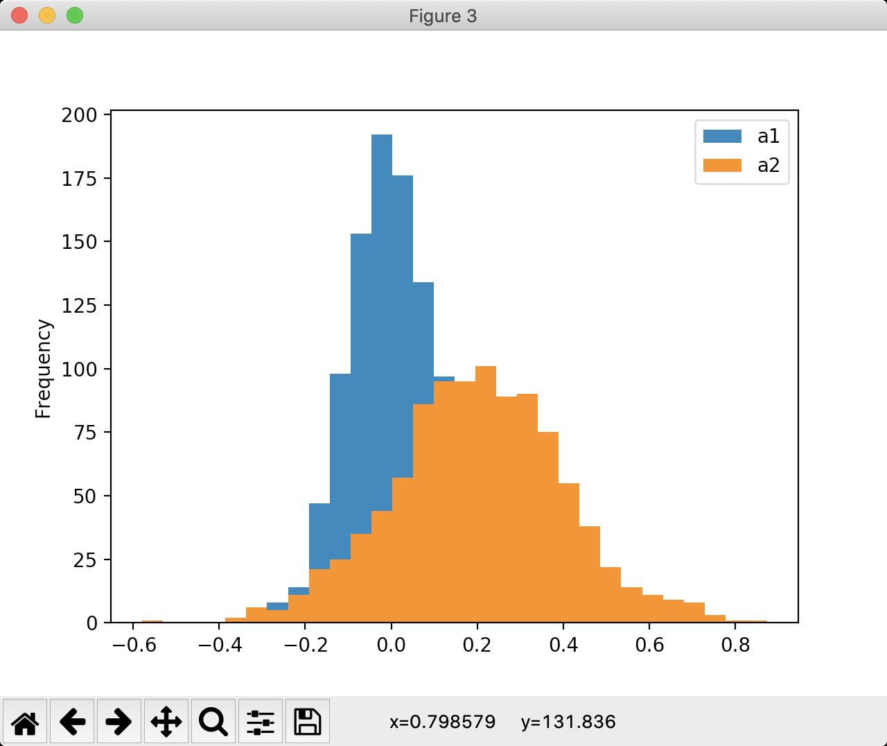 df[["a1", "a2"]].plot(bins=30, kind="hist") plt.show()