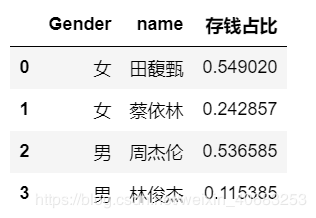 # 使用了 as_index=False,但是从输出结果中可见没起到作用 df_apply = df.groupby(['Gender', 'name'], as_index=False).apply(lambda x: sum(x['income']-x['expenditure'])/sum(x['income'])) df_apply = pd.DataFrame(df_apply,columns=['存钱占比'])#转化成dataframe格式