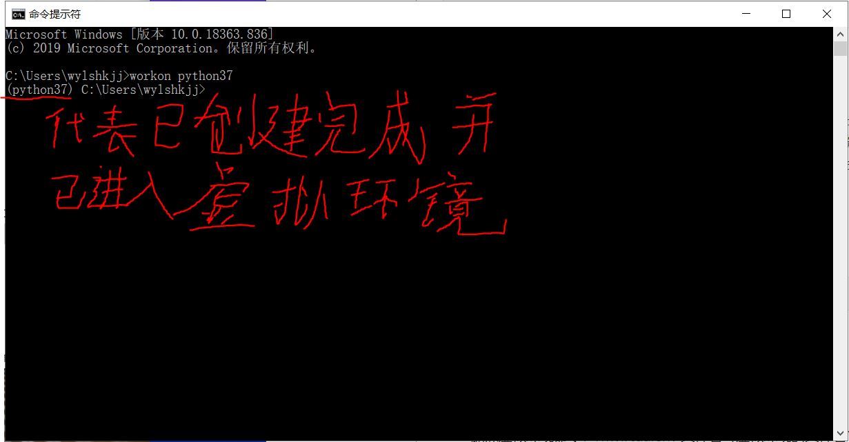 创建成功后会自动进入虚拟环境,由于我已创建,所以就用进入命令来模拟创建后的结果