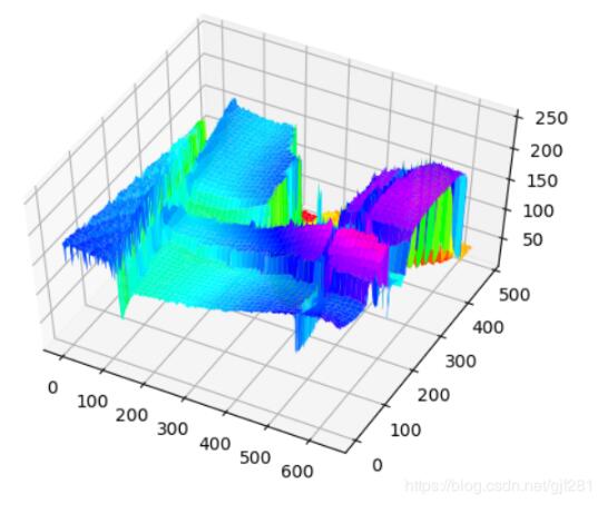 ax.plot_surface(X, Y, img_gray, cmap=cm.gist_rainbow)