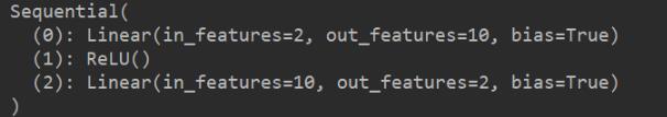 net = torch.nn.Sequential( torch.nn.Linear(2, 10), torch.nn.ReLU(), torch.nn.Linear(10, 2) ) print(net)