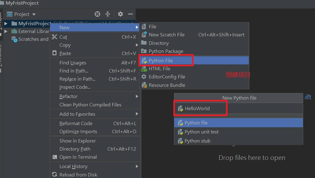 1.右击工程,点击"New",然后选择“Python File”。在弹出的对话框为新创建的项目取个名字。此处就取“HelloWorld”,点击"OK"。