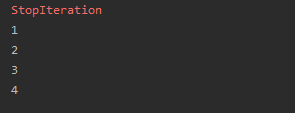 list1=[1,2,3,4] it=iter(list1)#赋值变量 print(next(it)) print(next(it)) print(next(it)) print(next(it)) print(next(it))#except,超出列表范围会报错误信息StopIteration