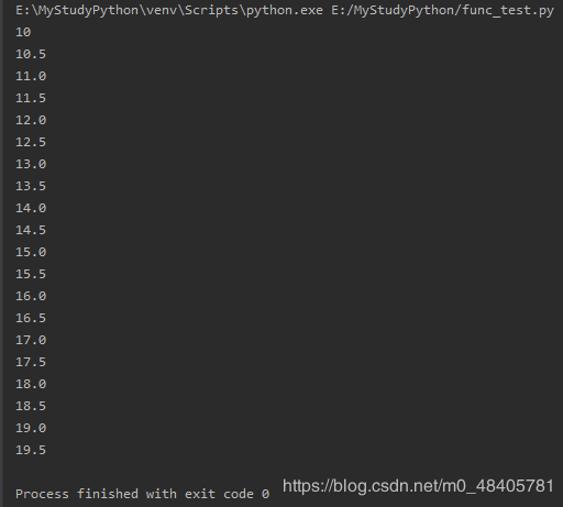 def frange(start,stop,step): x=start#定义一个变量 while x<stop: yield x #没有yield,while会把所有的值一次性进行返回;yield运行到这个位置,会暂停记录当前的位置,当你再次去调用一个next的时候,会根据当前的位置返回一个值给你 x+=step for i in frange(10,20,0.5): print(i)