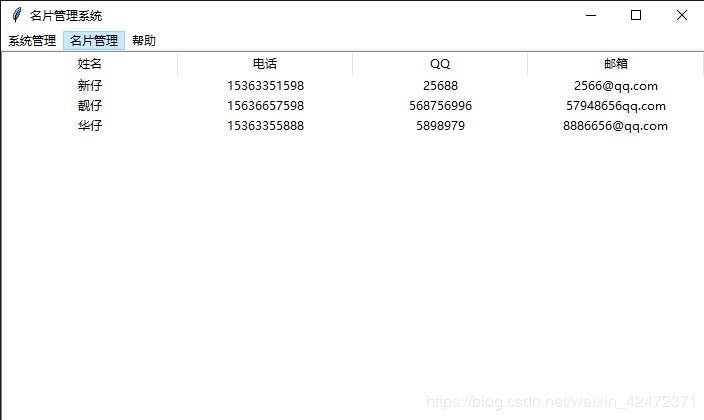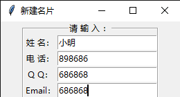 #card = {"姓名":name.get(),"电话":phone.get(),"QQ":qq.get(),"Email":email.get()}