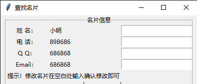 Label(lf1,text="提示!修改名片在空白处输入确认修改即可",anchor=E).grid(row=4, column=0, columnspan=3)