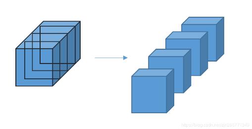 组卷积其实早在AlexNet中就用过了,当时因为GPU的显存不足因而利用组卷积分配到两个GPU上训练。简单来讲,组卷积就是将输入特征图按照通道方向均分成多个大小一致的特征图,如下图所示左面是输入特征图右面是均分后的特征图,然后对得到的每一个特征图进行正常的卷积操作,最后将输出特征图按照通道方向拼接起来就可以了。
