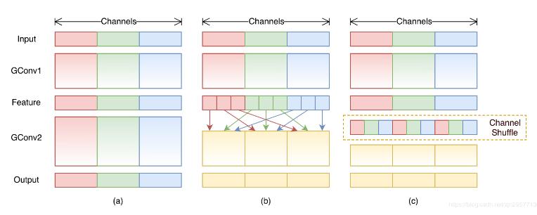 通道混洗是这篇paper的重点,尽管组卷积大量减少了计算量和参数,但是通道之间的信息交流也受到了限制因而模型精度肯定会受到影响,因此作者提出通道混洗,在不增加参数量和计算量的基础上加强通道之间的信息交流,如下图所示。
