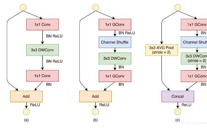 ShuffleNet的主要构成单元。下图中,a图为深度可分离卷积的基本架构,b图为1步长时用的单元,c图为2步长时用的单元。