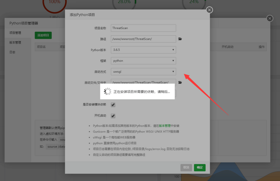 这里勾选“是否安装模块依赖”,会自动帮我们读取项目下的 requirements.txt ,然后安装响应的模块,所以这里的时间会比较长。