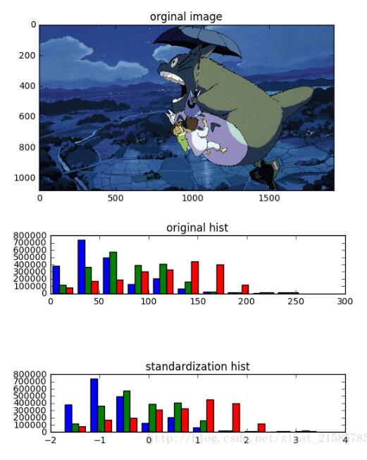 两幅hist图分别是原图和标准化后的RGB的像素值分布图,可以看到只是将图片的像素值大小限定到一个范围,但是像素值的分布为改变。