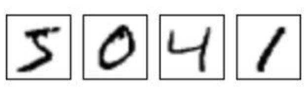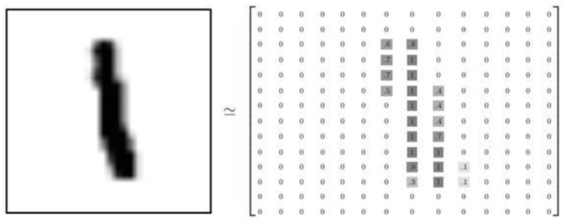 上图就是4张MNIST图片。这些图片并不是传统意义上.jpg或者jpg格式的图片,因.jpg或者jpg的图片格式,会带有很多干扰信息(如:数据块,图片头,图片尾,长度等等),这些图片会被处理成很简易的二维数组,如图: