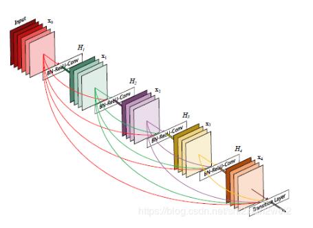 DenseNet结构在16年由Huang Gao和Liu Zhuang等人提出,并且在CVRP2017中被评为最佳论文。网络的核心结构为如下所示的Dense块,在每一个Dense块中,存在多个Dense层,即下图所示的H1~H4。各Dense层之间彼此均相互连接,即H1的输入为x0,输出为x1,H2的输入即为[x0, x1],输出为x2,依次类推。最终Dense块的输出即为[x0, x1, x2, x3, x4]。这种结构个人感觉非常类似生物学里边的神经元连接方式,应该能够比较有效的提高了网络中特征信息的利用效率。