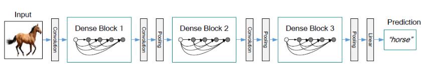 将上述结构按照论文中提出的结构进行拼接,这里选择的参数是论文中提到的L=100,k=12,网络连接如下: