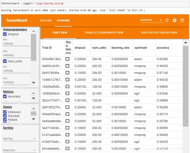 Tensorboard为超参数调优提供了一种可视化的方式来了解哪些超参数可以用于微调深度学习模型以获得最佳精度,更多的操作可以查看官方文档: