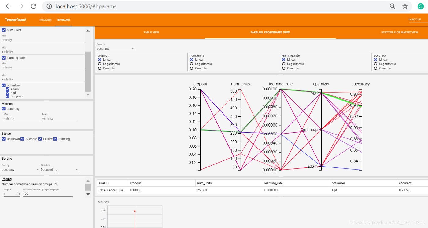 在Tensorboard中使用Parallel Coordinates视图,显示每个超参数的单独运行情况并显示精度,查找最优化的超参数,以获得最佳的模型精度