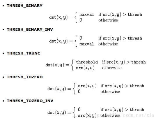 其中对于输入图像img首先使用阈值处理获得二值化图像,cv2.threshold表示进行阈值二值化处理,0.1是设定的阈值(img是0-1图像),1表示图像中的最大值,cv2.THRESH_BINARY表示图像处理的方法,在openCv中有如下记录