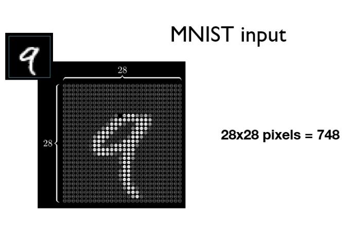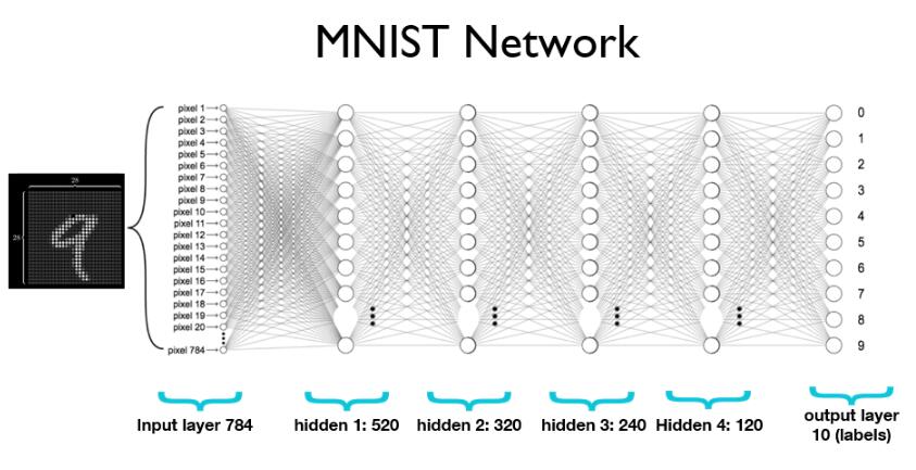 MNIST数据集是经典图像数据集,包括10个类别(0到9)。每一张图片拉成向量表示,如下图784维向量作为第一层输入特征。