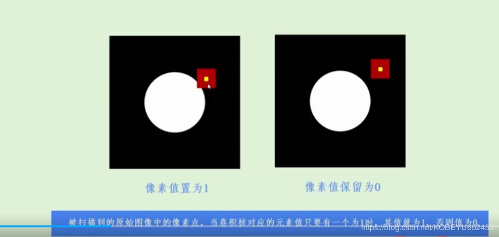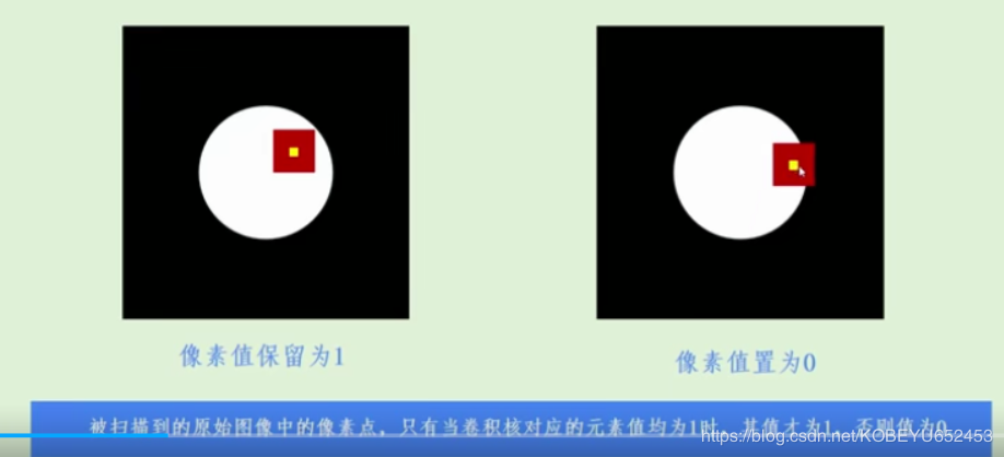 使用卷积核遍历原始二值图像,如果卷积核对应的元素值均为1,其值才为1,否则为0。如图,红色为卷积核。